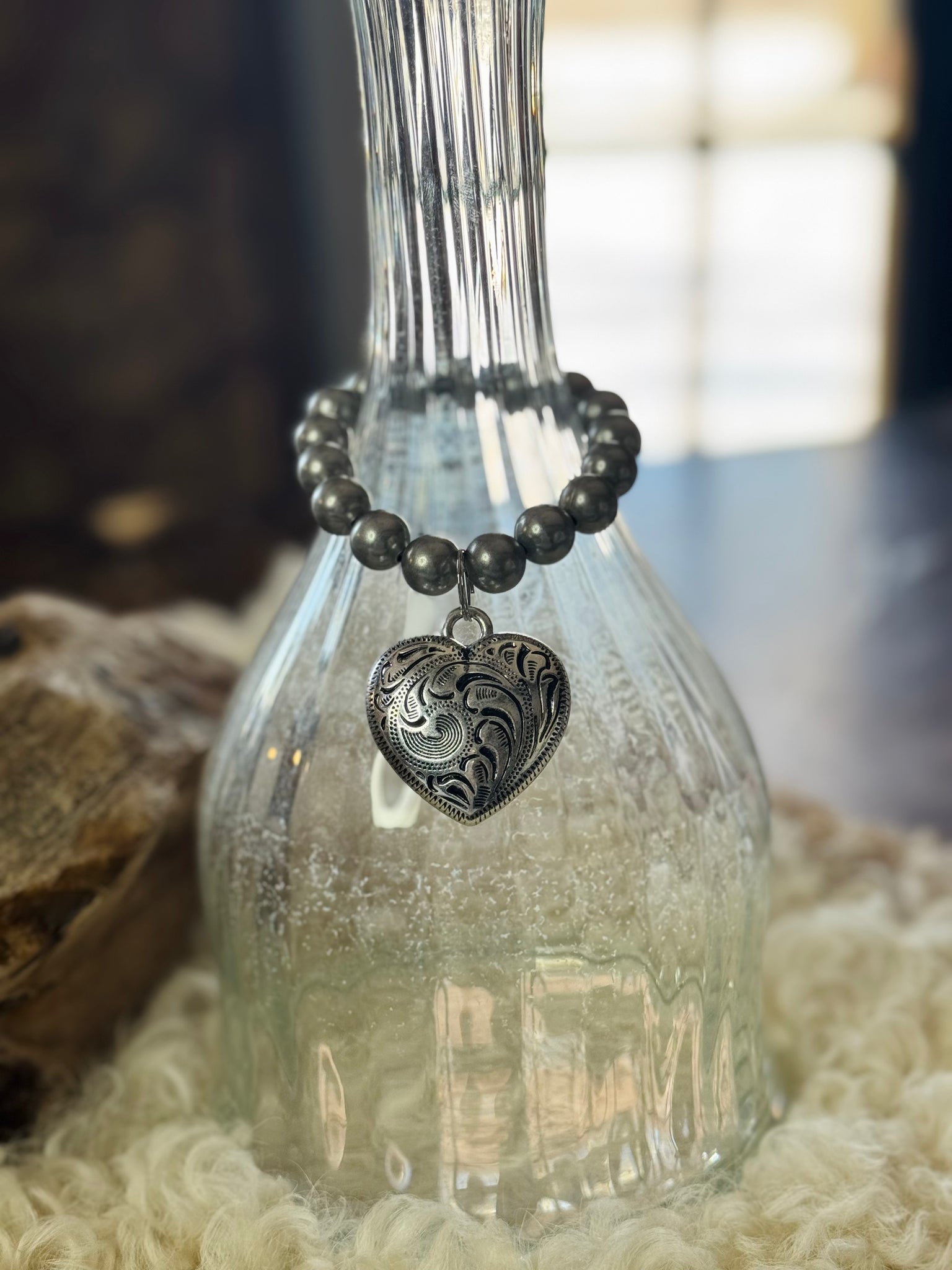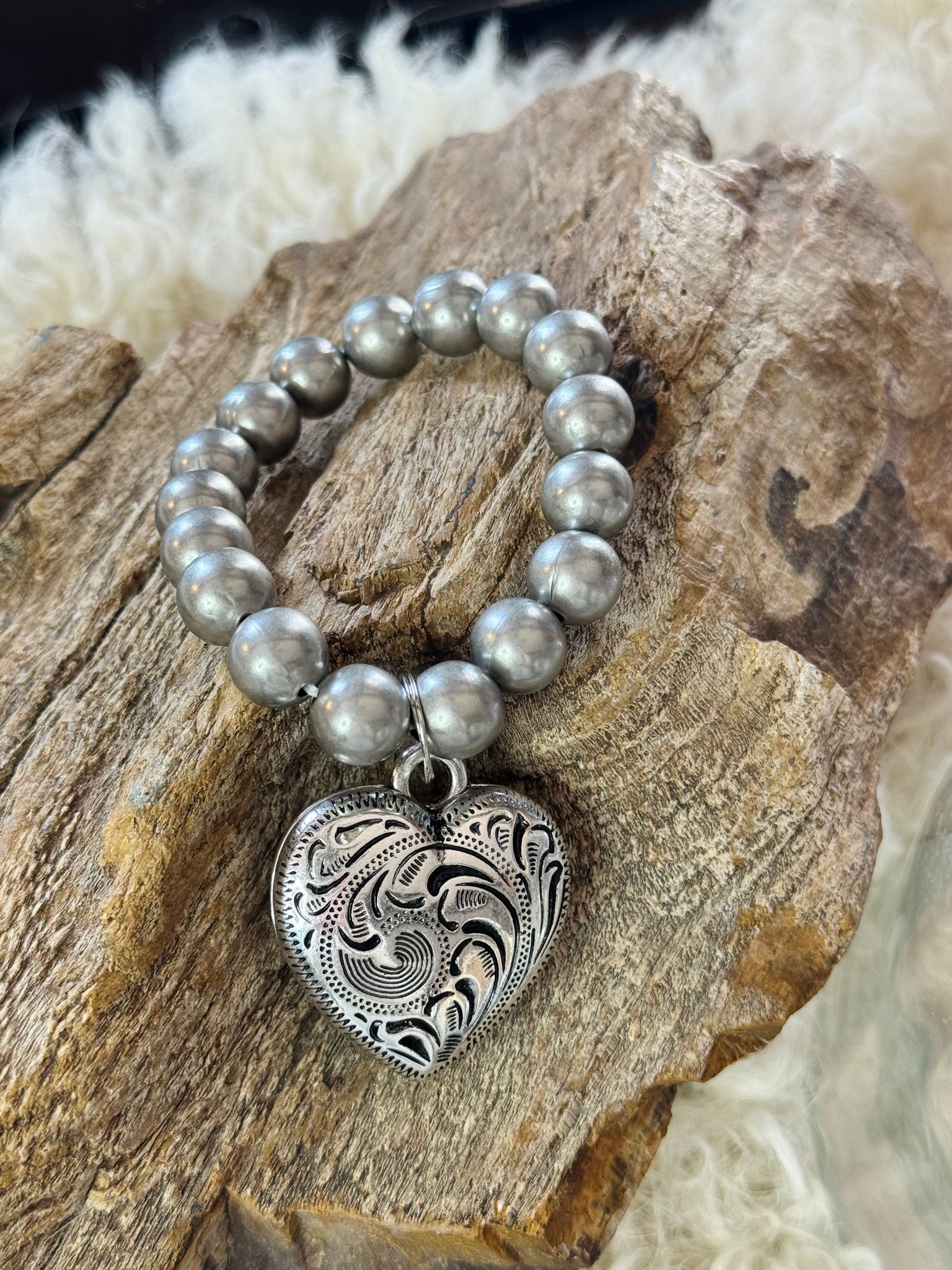 A timeless Western stretch bracelet featuring faux Navajo pearls and an etched silver heart charm.  Perfect worn solo or stacked for an effortless, everyday western look.