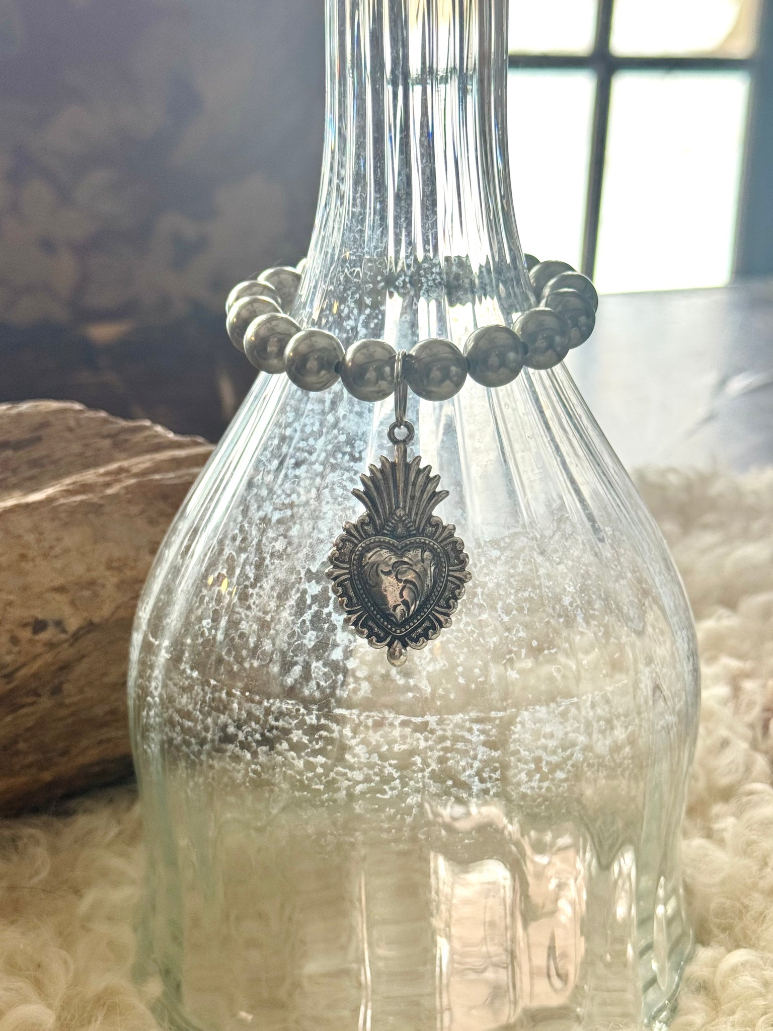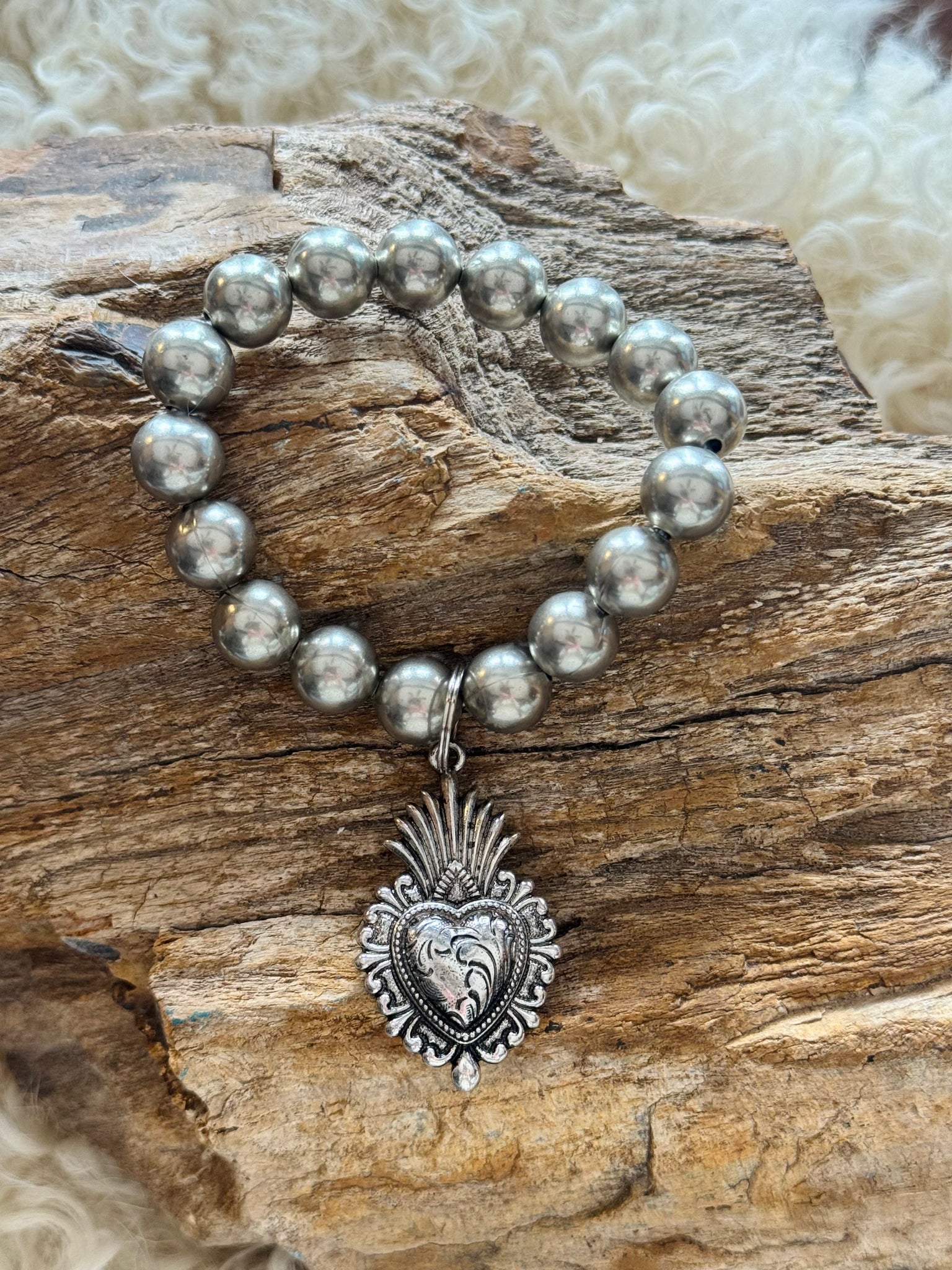 Stretchable faux Navajo bead bracelet finished with a vintage-inspired Sacred Heart charm. Easy to wear, meaningful, and perfect for stacking or standing alone.