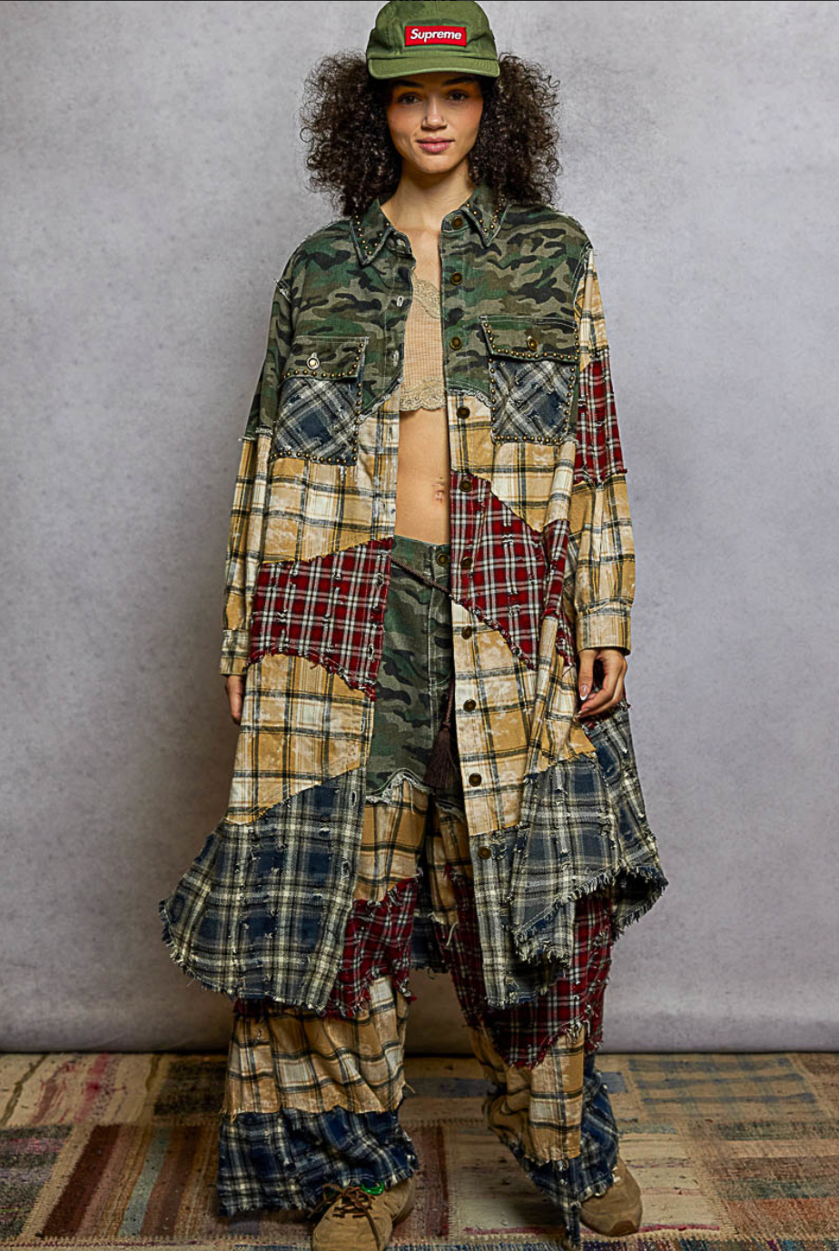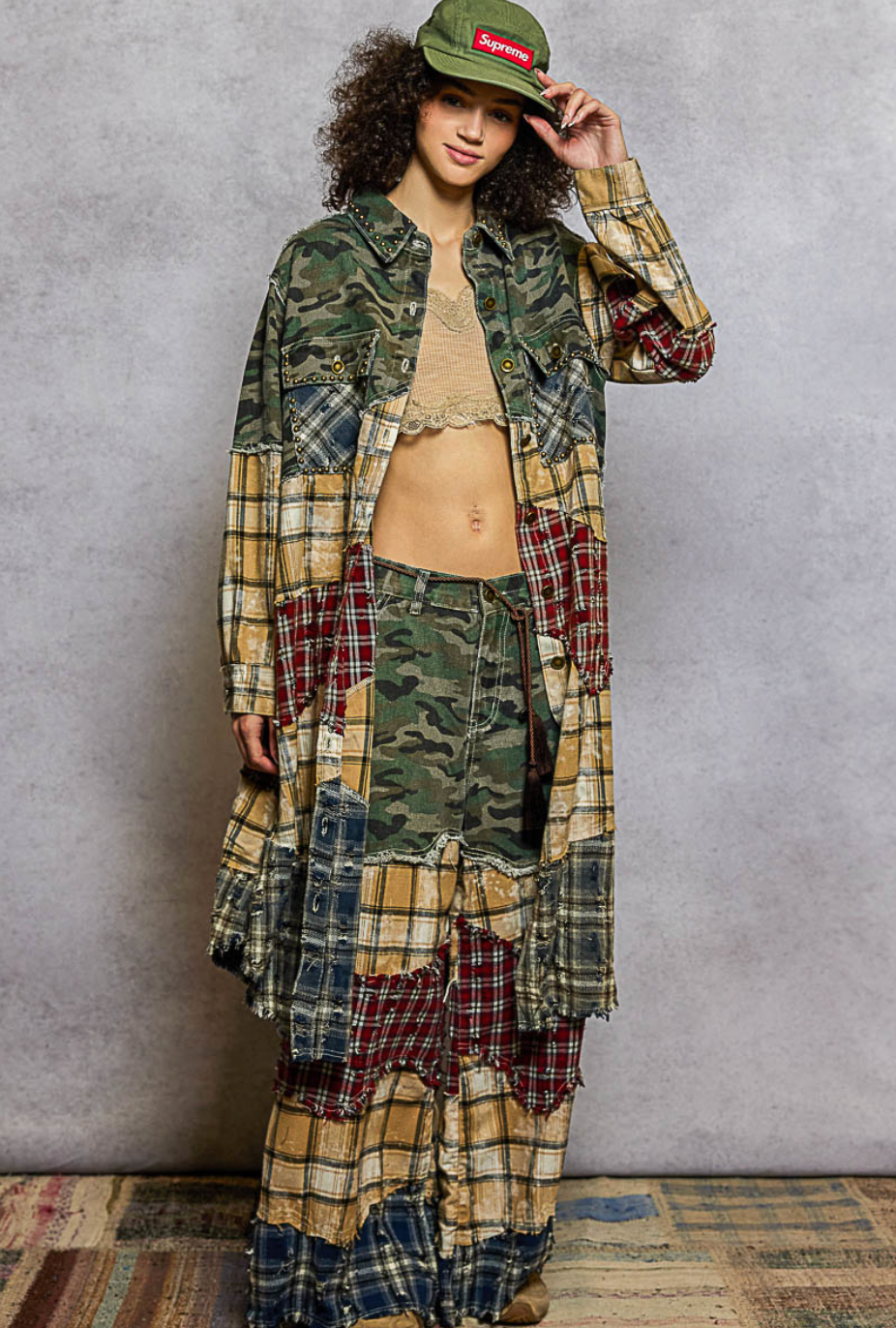 Meet the jacket that turns heads everywhere it goes. This long patchwork shirt jacket blends rugged camo with warm plaids and vintage-inspired textures for a true ranch-meets-boho look. Stud details and mixed fabrics give each piece a one-of-a-kind feel, while the roomy fit makes it perfect for layering through every season.