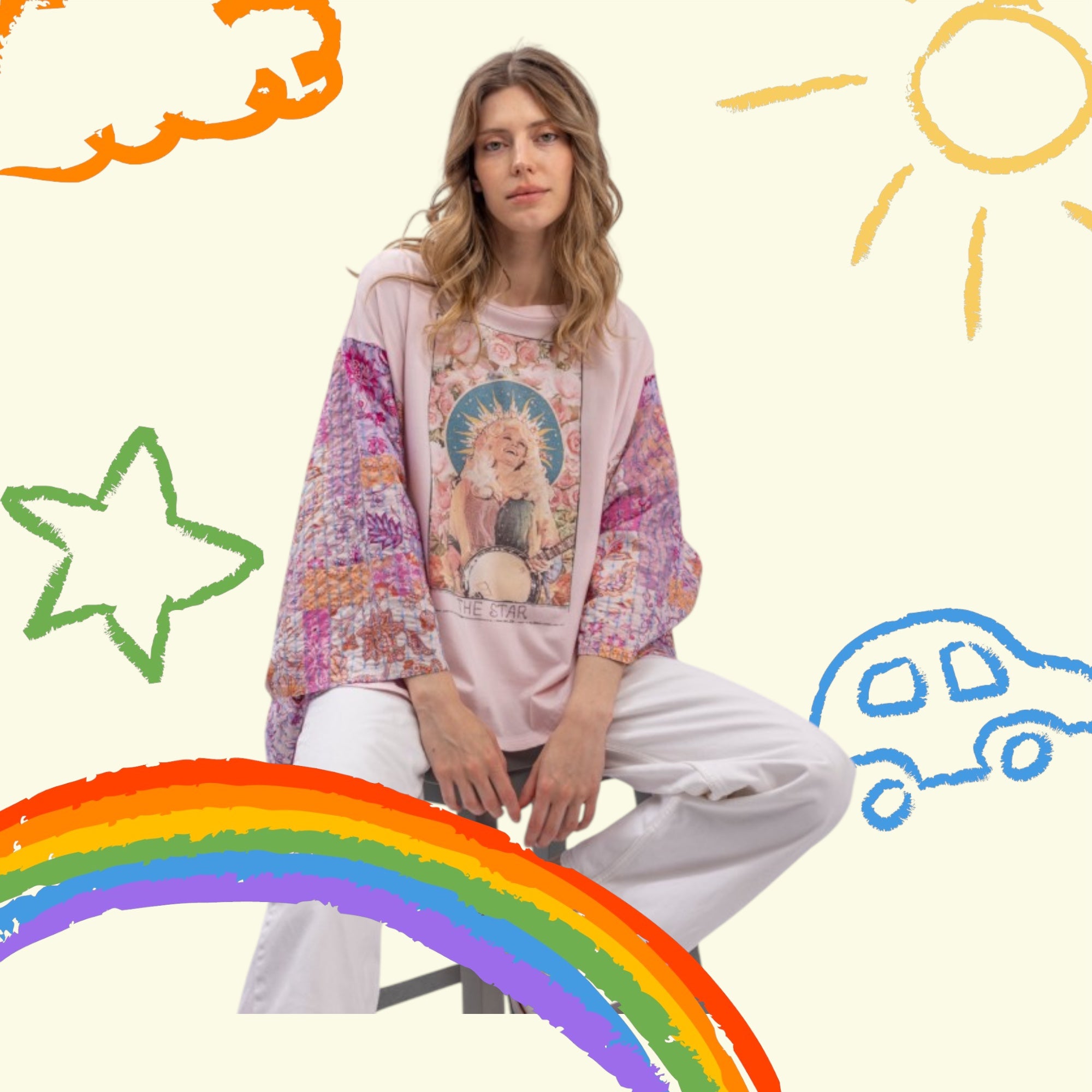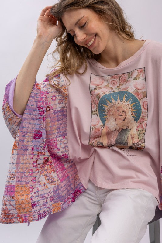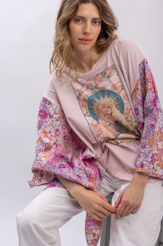 UPCYCLING INSPIRED MIX MEDIA TOP 3/4 TO LONG SEEVE LENGTH OVERSIZED BOXY FIT WITH REGULAR BODY LENGTH CREW NECK MINERAL WASHED