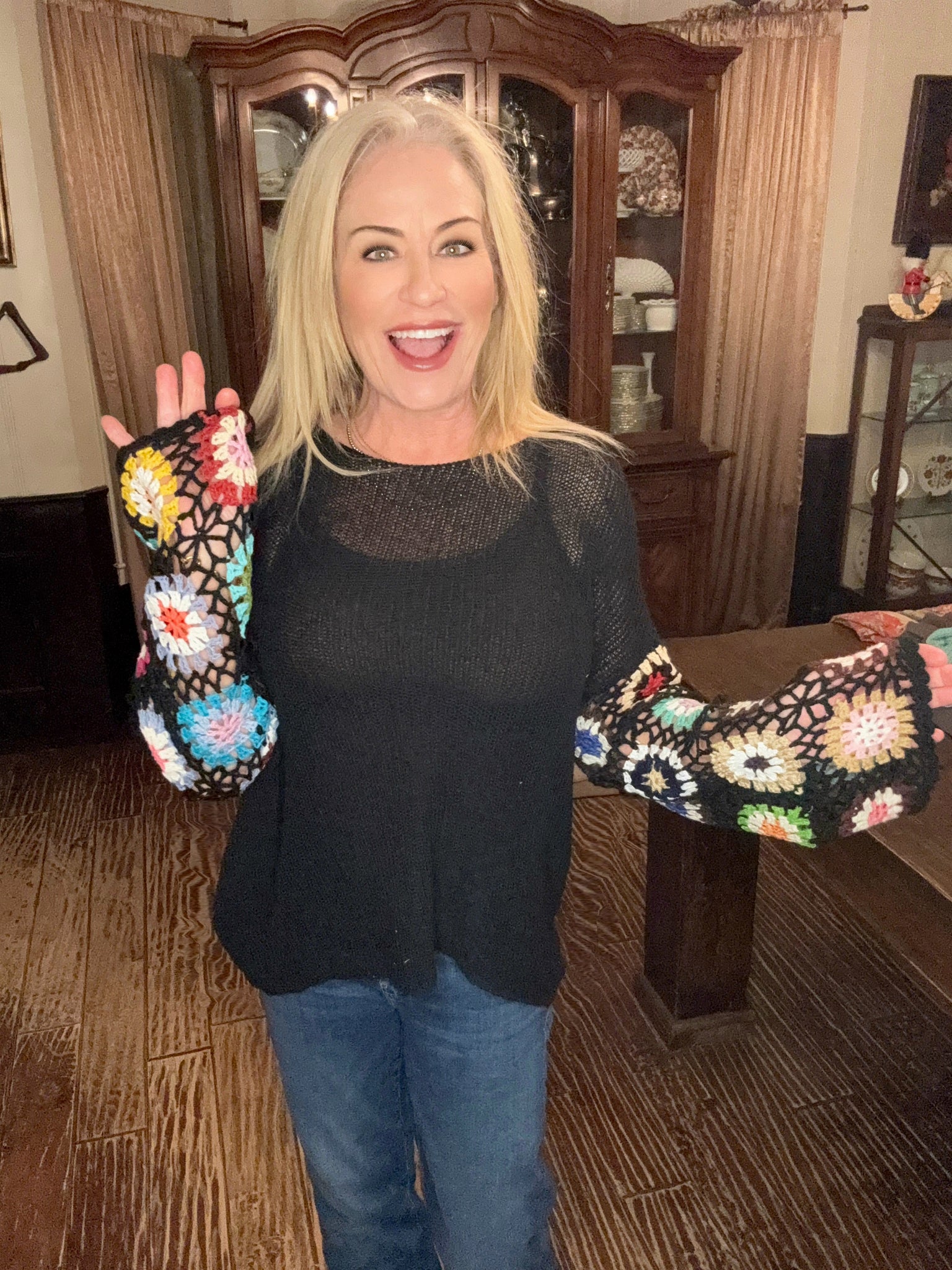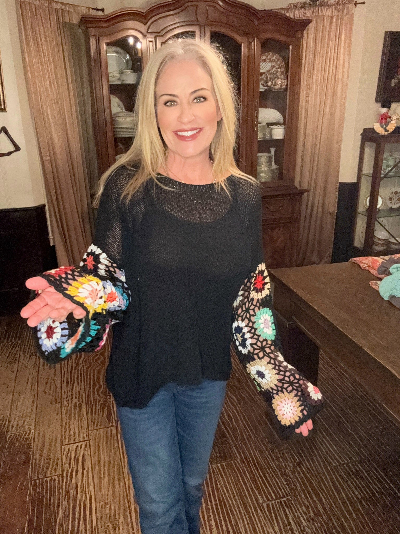 The open-weave sleeves feature playful, multicolor crochet detailing that adds just the right pop, while the body stays soft, drapey, and flattering. Easy to dress up or down, this one works just as well with denim and boots as it does layered over a tank for warmer days.