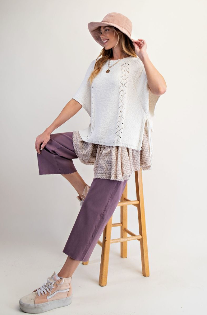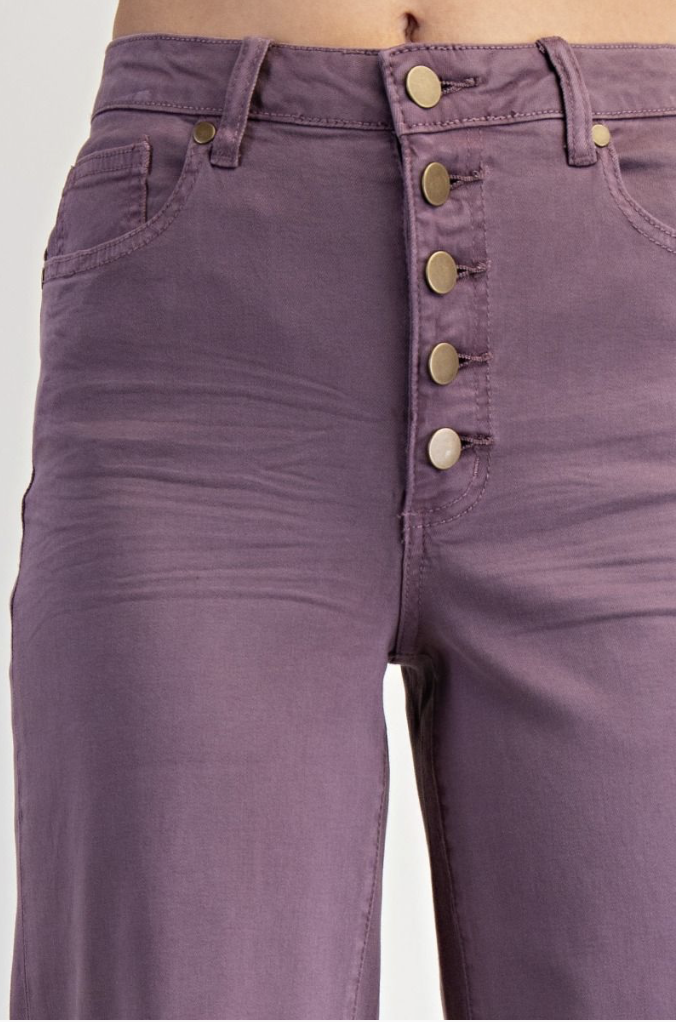 Description: BUTTON FRONT STRETCH TWILL PANTS-STRAIGHT LEG-SLIGHTLY RELAXED SILHOUETTE-HIGH WAISTEDFRONT BUTTON FLY WITH METALLIC BUTTONS-RAW HEM-5 POCKET STYLING