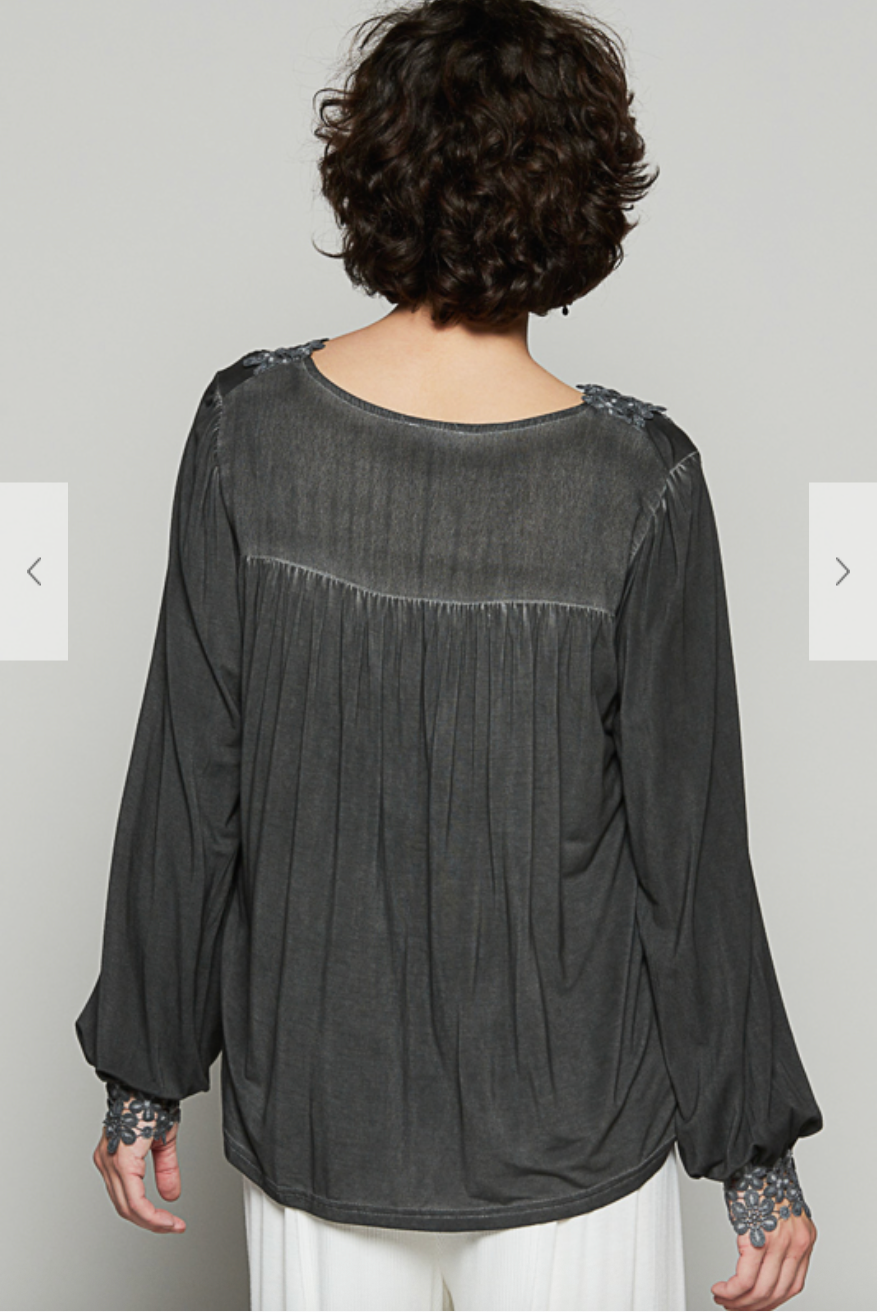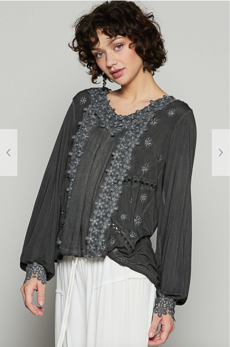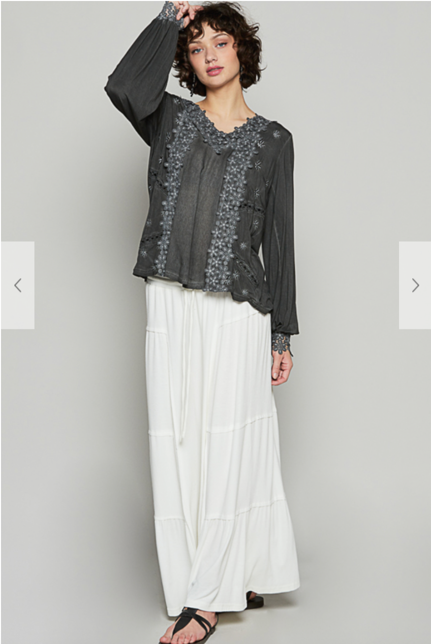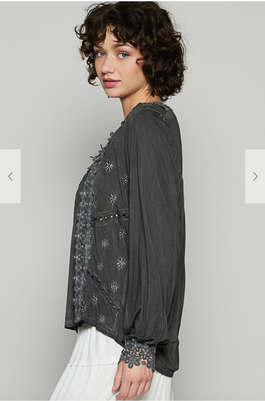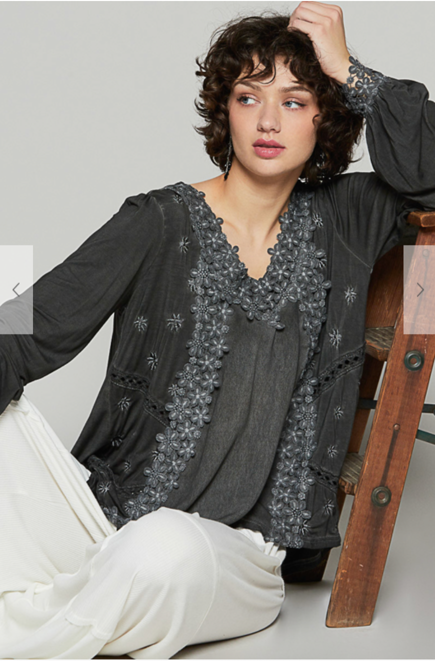 Our "Feminine Floral Embroidery Woven Top" features relaxed fit with floral lace trim sewn on low V neckline and body floral embroidery detailing on the side front with see through lace shirring on back below yoke for roomy fit and finished with clean hem. A top that comes with shirred long sleeve with scallop floral trim as band with side button closure.