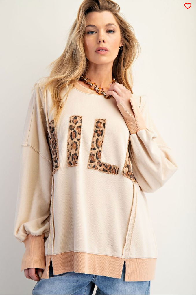 Description: OVERSIZED WASHED TERRY PULLOVER -RELAXED OVERSIZED FIT -WILD TEXT ON FRONT IN LEOPARD PRINT PATCH -DROPPED SHOULDERS -EXPOSED SEAMS -SMALL MEASUREMENTS : LENGTH - 26.5" & BUST - 27.25" *****AVAILABLE IN PLUS SIZE *****PLEASE CHECK AVAILABLE DATE*****